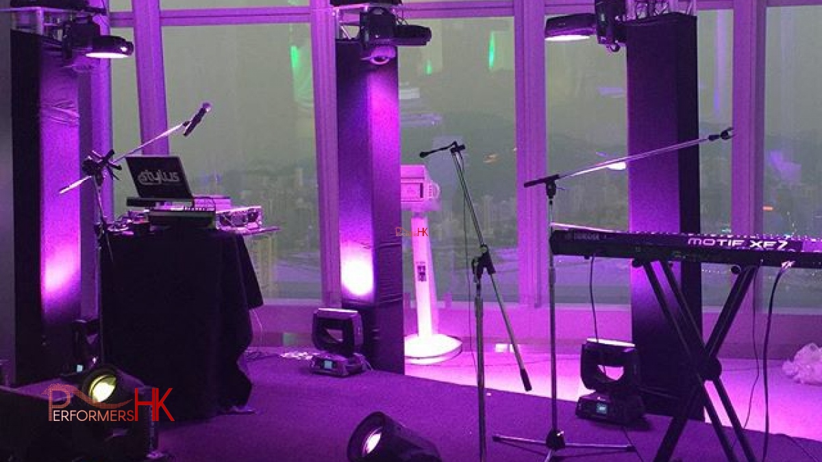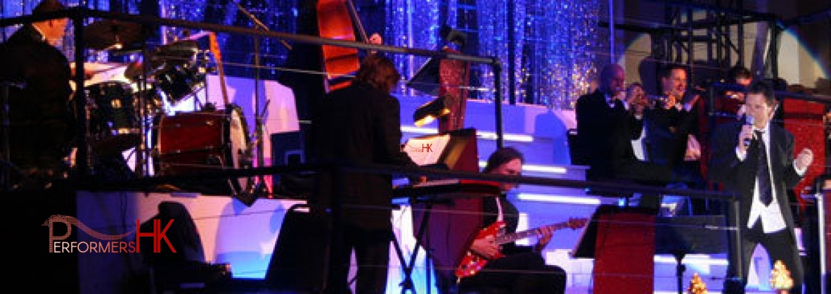 Big band music or Classic instrument infused fusion Pop set up. 12 piece band photo with singer, violinist, bass player, percussion, keyboard, brass section